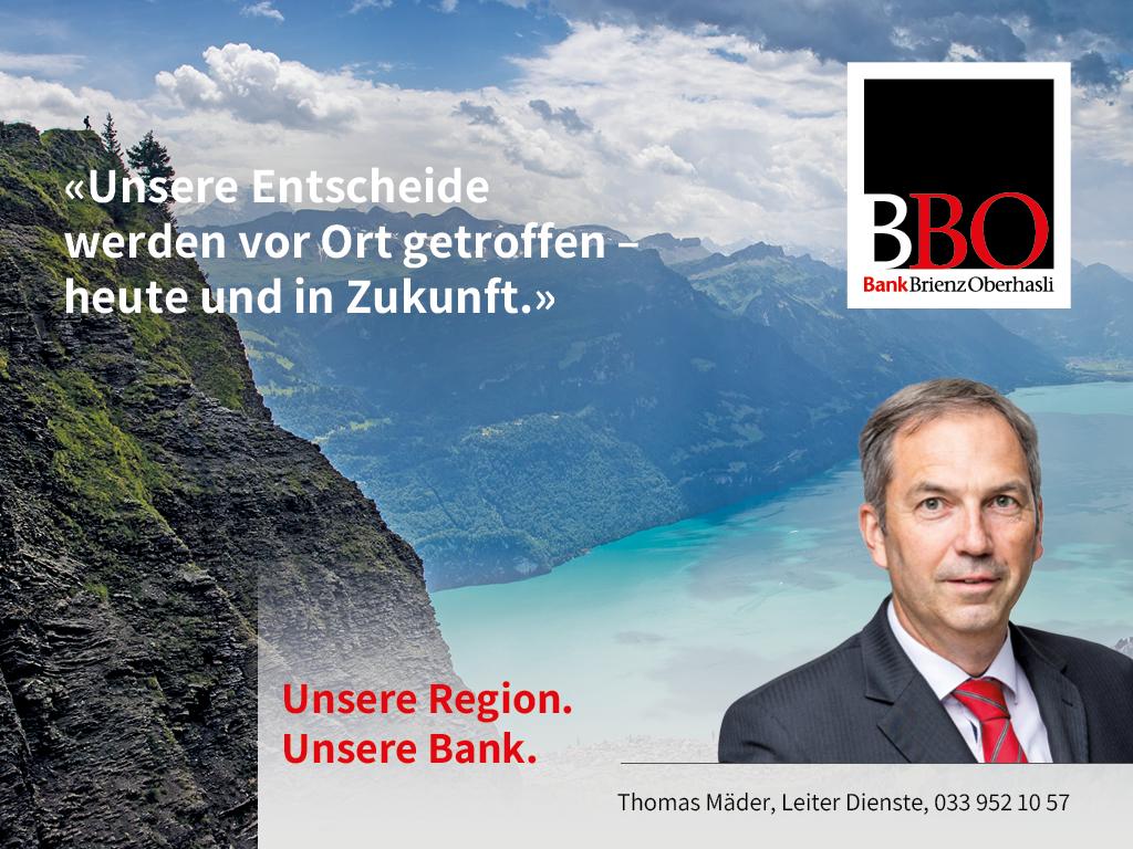 Die BBO Bank Brienz Oberhasli AG ist eine selbstständige Regionalbank mit Standorten in Brienz und Meiringen. Unsere Entscheide werden vor Ort getroffen. Wir suchen gemeinsam mit Ihnen individuelle Lösungen, um Ihre Wünsche zu erfüllen und interessante Projekte zu realisieren. Wir bieten sämtliche Bankdienstleistungen in den Bereichen Zahlen, Sparen, Anlegen, Finanzieren, Vorsorgen und Zahlungsmittel an.